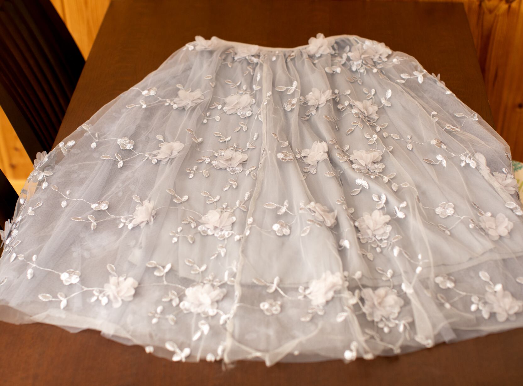 透け感のあるチュールに小花モチーフが散りばめられ、
