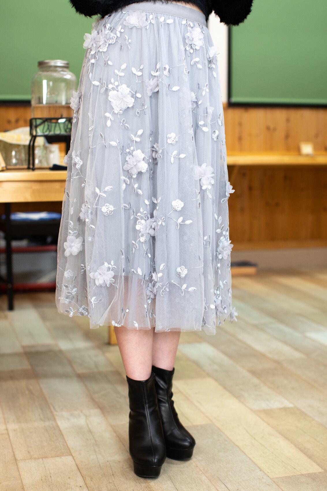 繊細な立体フラワー刺繍が美しい、フェミニンなチュールスカート。