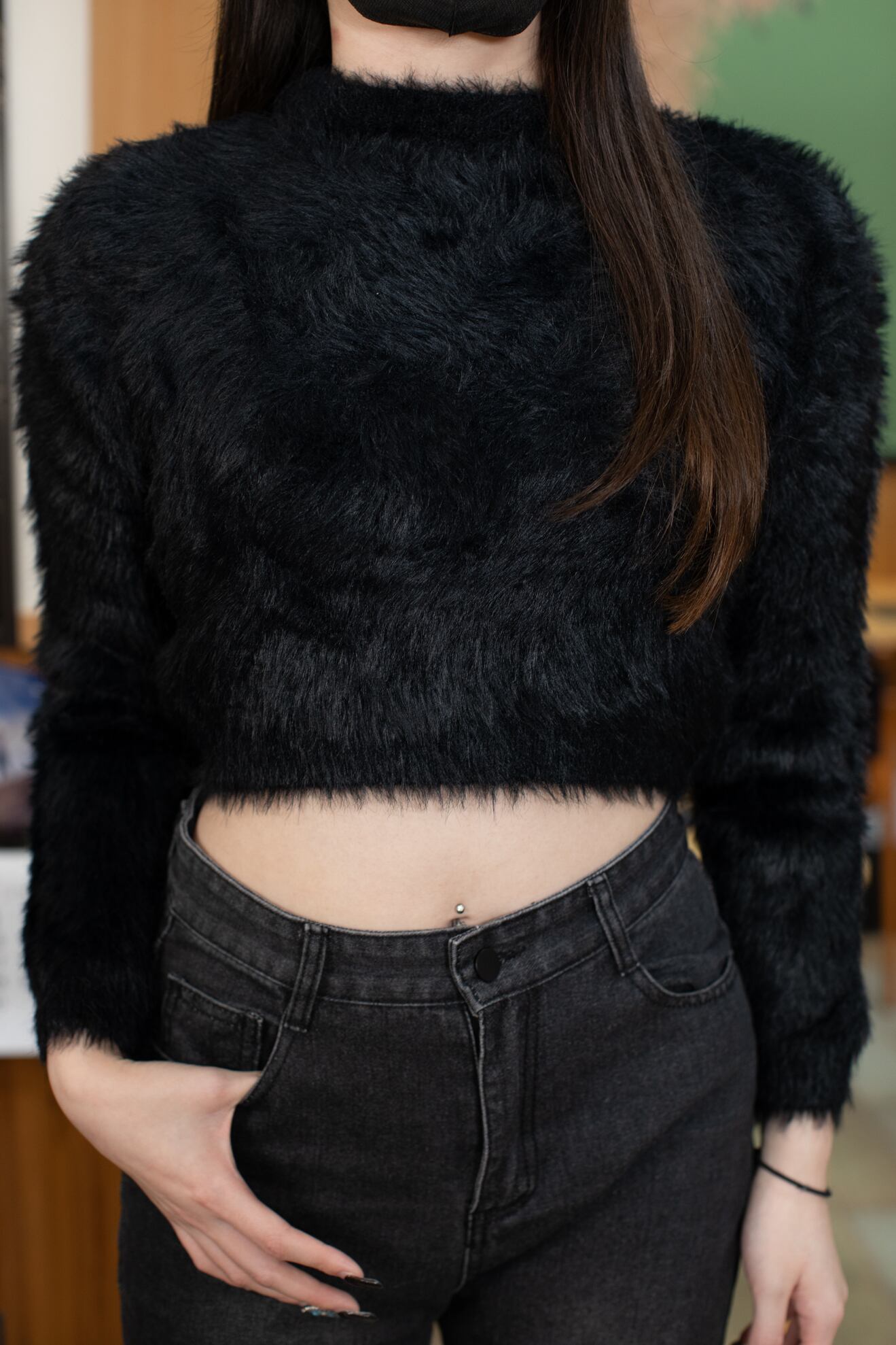 ふんわりとしたシャギー素材が大人可愛いショート丈トップス。
