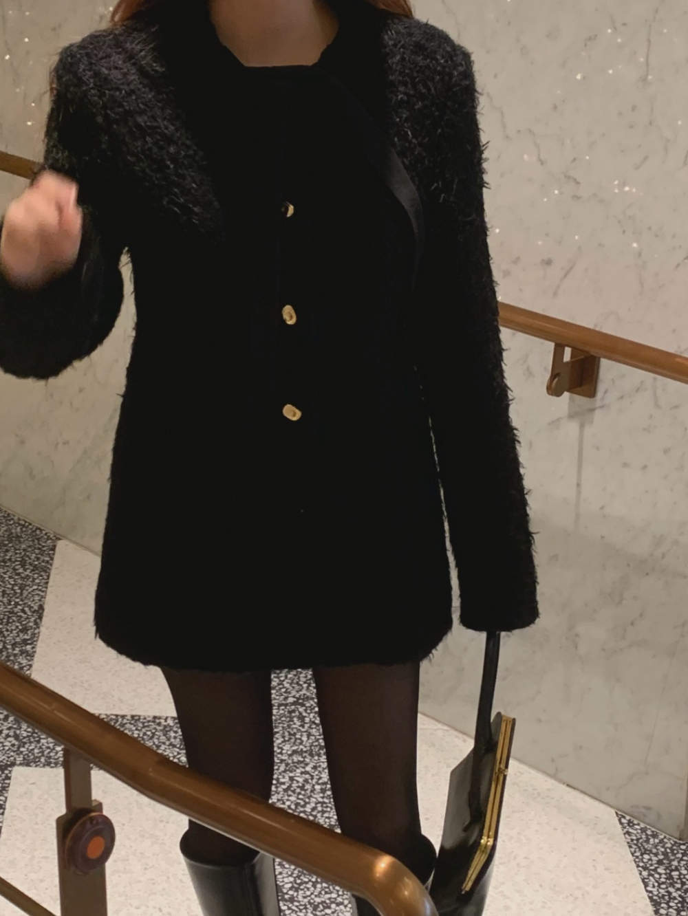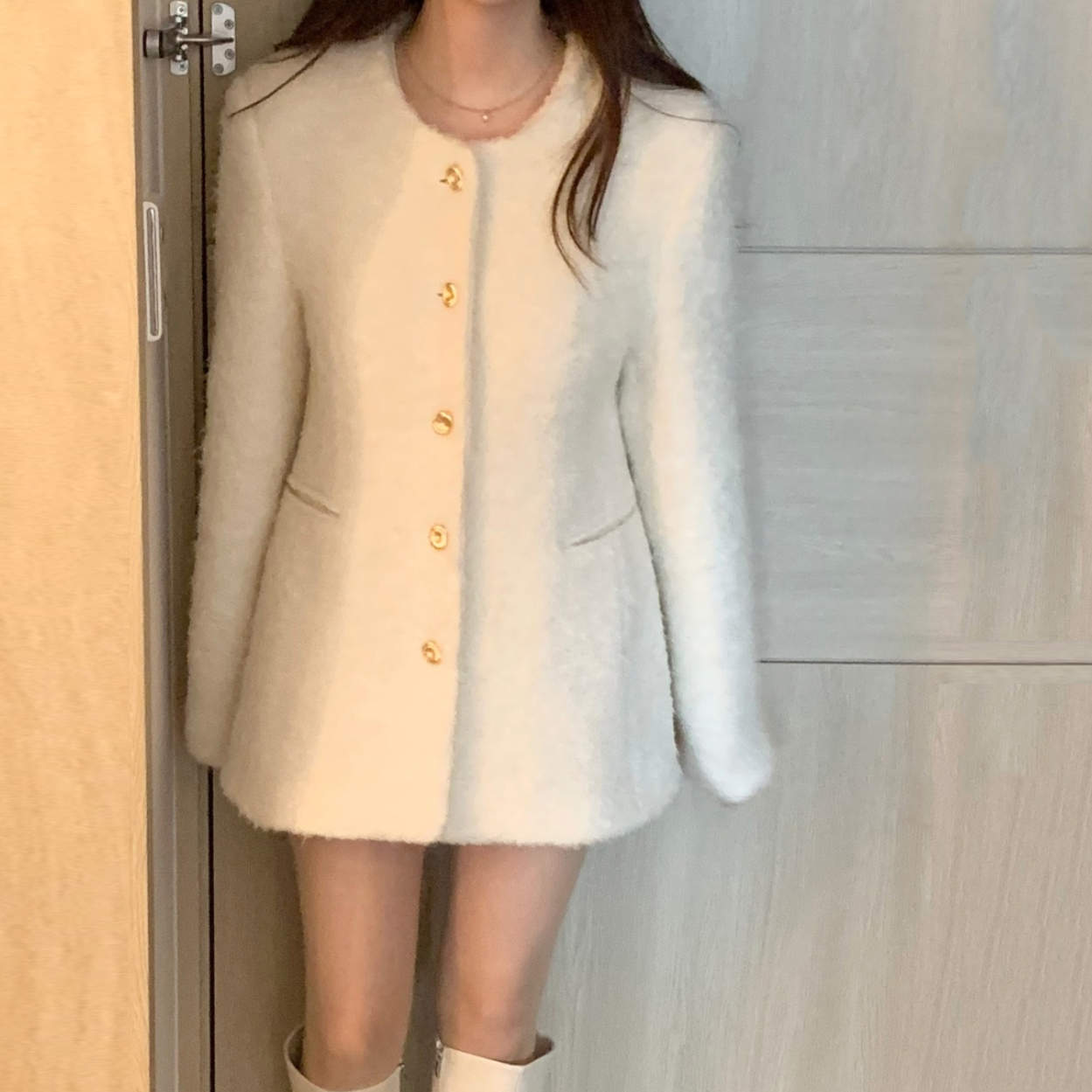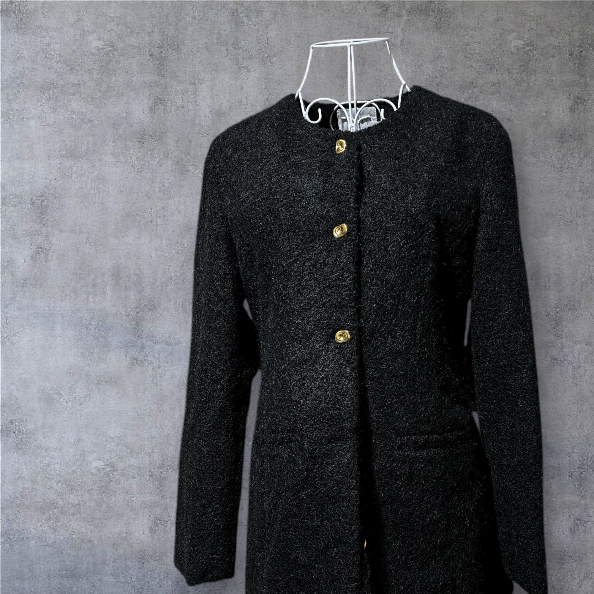 ゴールドボタンがアクセントになり、シンプルながら高級感を演出。