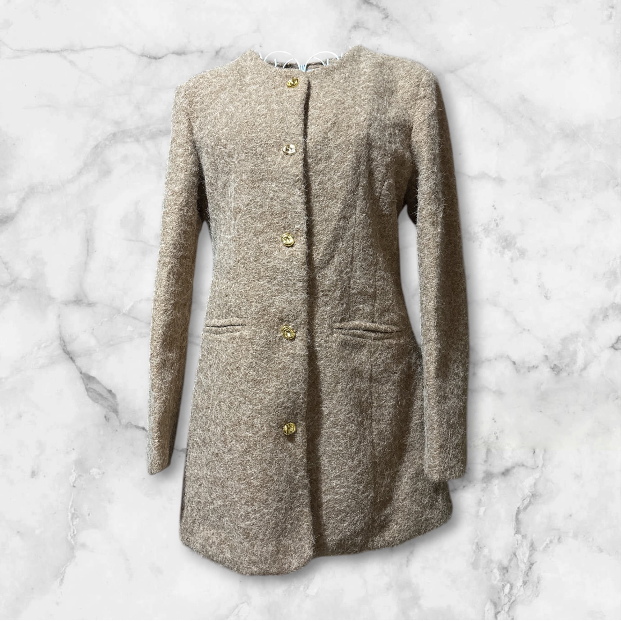 上品なノーカラーロングジャケットです。